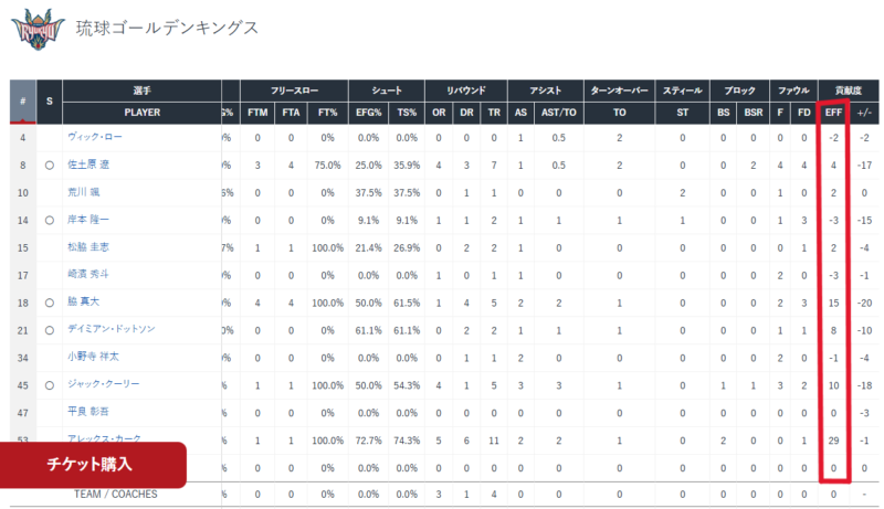 バスケットボールのスタッツには、「貢献度(EFF)」という指標があります