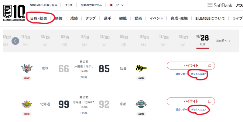 「日程・結果」を押すと、日ごとの試合結果が表示されるので、確認したい試合の「ボックススコア」を押しましょう